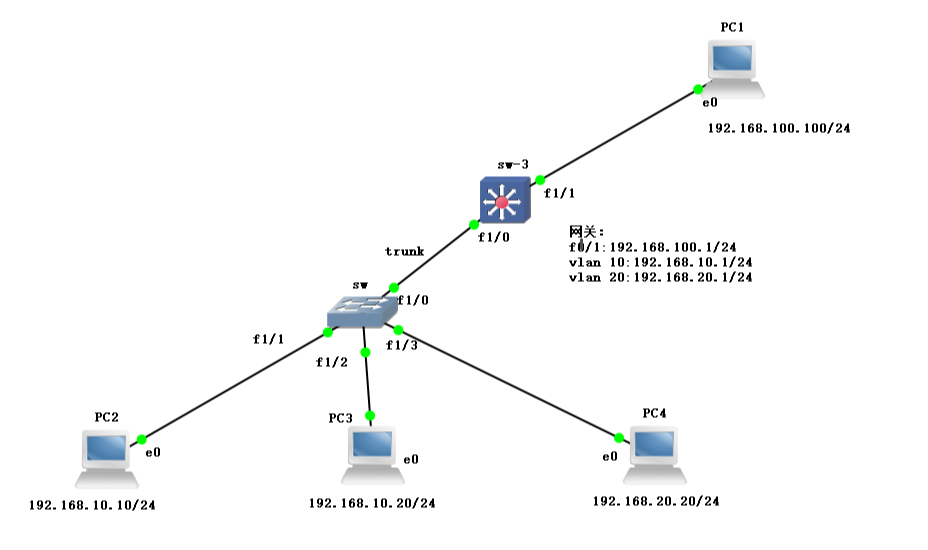 sw3(config)#vlan 10,20 ##创建vlan10,20
