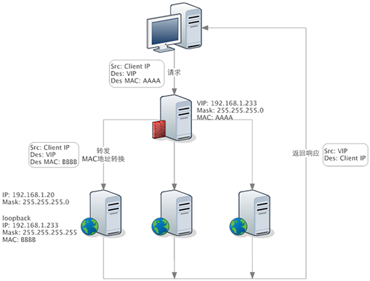一个请求过来时,LVS 只需要将网络帧的 MAC 地址修改为某一台 RS 的 MAC,该包就会被转发到相应的 RS 处理,注意此时的源 IP 和目标 IP 都没变,LVS 只是做了一下移花接木。