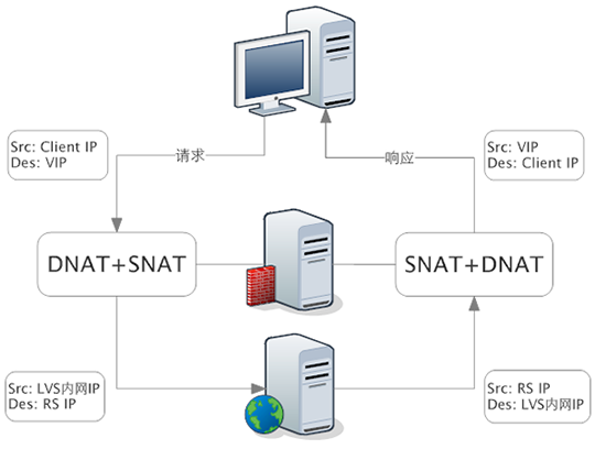 LVS 收到包后,在 NAT 模式修改源地址的基础上,再把 RS 发来的包中的目标地址从 LVS 内网 IP 改为客户端的 IP。