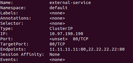 创建一个没有pod选择器的服务,编辑external-service.yaml并创建,然后kubectl describe svc external-service,发现并没有Endpoints