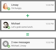 将同一类通知进行统一管理:当应用中需要发送同一类型的通知时,可将这些通知合并为一条摘要通知,而不是每次都新建一条通知。具体的应用场景有如短信、即时消息等,如: