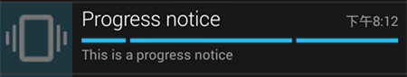 通知的进度指示器是用ProgressBar平台实现类来显示,用 setProgress(int max, int progress, boolean indeterminate)方法来设置的。该方法有三个参数: