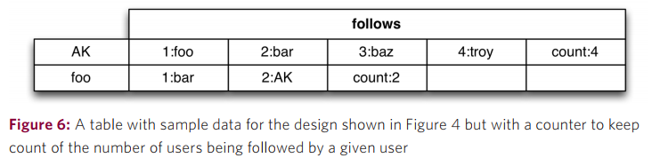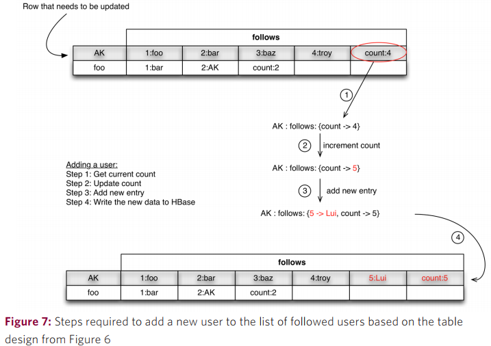在初始方案的基础上,添加一个counter记录列族中所有列的总数量,当添加新的被关注用户时,这个新用户的序号就是counter+1。但是当要取消关注某个用户时,一样得遍历所有的列数据,而且最大的问题是在于HBase不支持事务处理,这种通过counter来添加被关注用户的操作逻辑得写在客户端中。