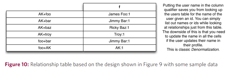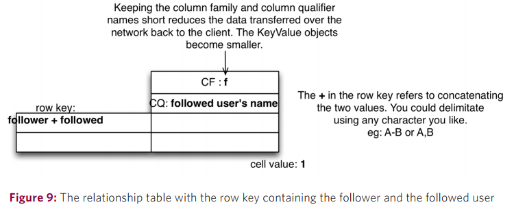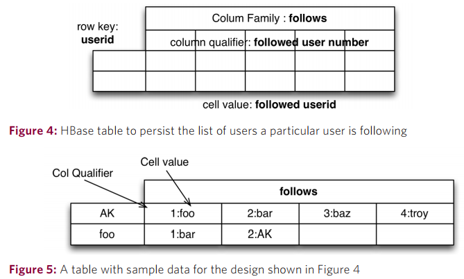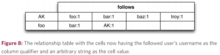 每一行代表着某个用户和所有他所关注的其它用户。这个用户ID作为Row Key,一个列族follows,而每一个列标识(Column Qualifier)就是这个用户所关注的其他用户在列族里的序号,单元数据就是这个用户所关注的其他用户的用户ID。在这种表结构的设计下,“每个用户都关注了谁”这个问题很好解决,但对于“用户A有没有关注用户B”这个问题在列很多的时候,需要遍历A用户所在Row的所有单元数据去找到用户B,这样的开销会十分大。并且当添加新的被关注用户时,因为不知道给这个新用户分配什么样的列族序号,需要遍历整个列族中的所有列找出最后一个列,并将最后一个列的序号+1给新的被关注用户作为列族内的序号,这样的开销也十分大。