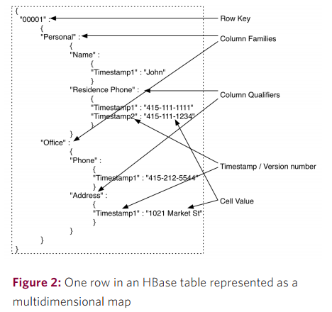 Hbase一定程度上又可以看成一个多维度的Map模型去理解它的数据模型。即以行键(Row Key),列标识(column qualifier),时间戳(timestamp)标识的有序Map数据结构的数据库,具有稀疏,分布式,持久化,多维度等特点。正如下图,一个行键映射一个列族数组,列族数组中的每个列族又映射一个列标识数组,列标识数组中的每一个列标识(Column Qualifier)又映射到一个时间戳数组,里面是不同时间戳映射下不同版本的值,但是默认取最近时间的值,所以可以看成是列标识(Column Qualifier)和它所对应的值的映射。用户也可以通过HBase的API去同时获取到多个版本的单元数据的值。Row Key在HBase中也就相当于关系型数据库的主键,并且Row Key在创建表的时候就已经设置好,用户无法指定某个列作为Row Key。