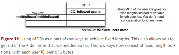 - 对Row Key的Hash优化能获得固定长度的Row Key并使数据分布更加均匀一些,而不是集中在一台服务器上,但是也牺牲了一定的数据排序和读取性能。