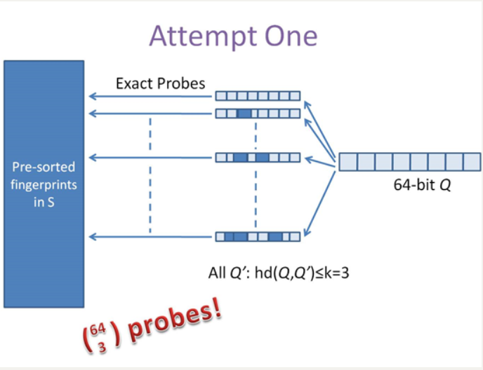 在引入simhash的索引结构之前,先提供两种常规的思路。第一种是方案是查找待查询文本的64位simhash code的所有3位以内变化的组合,大约需要四万多次的查询,参考下图: