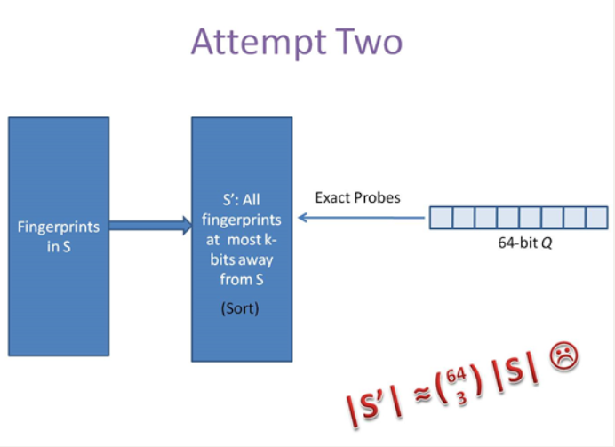 另一种方案是预生成库中所有样本simhash code的3位变化以内的组合,大约需要占据4万多倍的原始空间,参考下图: