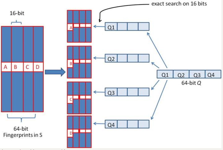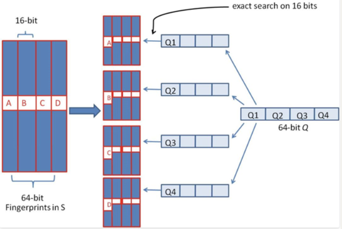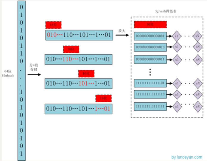 图片左侧表示了一个simhash索引了4份,右侧表示查询时的分段4次查找。