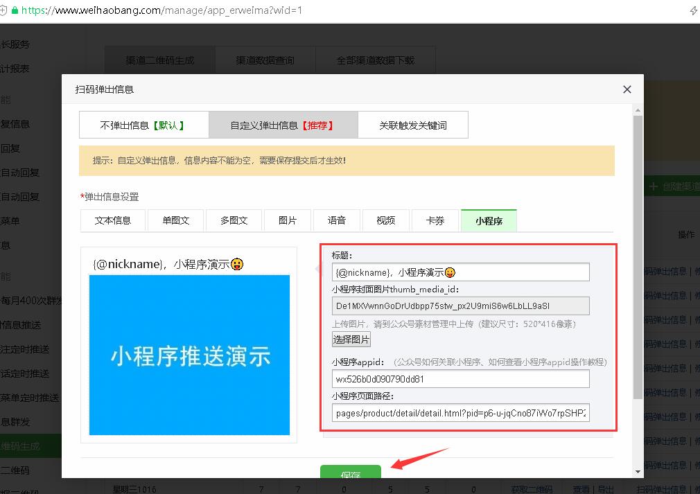 微号帮平台通过带参数的二维码,每个二维码为一个渠道,每个二维码支持不同的消息类型设置,文本信息、图文消息、卡券、小程序、图片、音频、视频都可以设置成扫码回复消息。