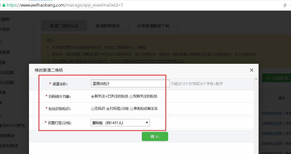 渠道二维码生成功能,微号帮支持自定义扫码回复、粉丝打标签分组、修改备注名,粉丝关注数据统计。