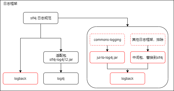 SpringBoot则选用了slf4j规范+logback日志框架;并通过中间包统一其他日志框架到slf4j规范