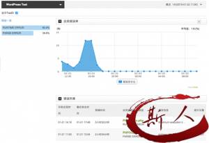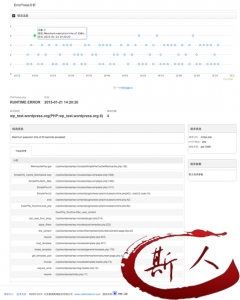 为了测试听云对错误分析的功能和准确性,我特地修改了WordPress上的一个页面,在PHP代码里人为引入了一个语法错误,并在一段时间内让应用的执行时间超过PHP应用的缺省最长执行时间(30s)。下图是听云提供的应用错误率的统计图表和错误日志列表。