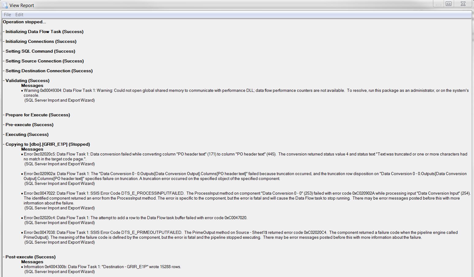 I am using Excel 2010 and SSMS 2012. The import failed this week and I have been unable to determine why. I was able to successfully import the data into a new table. The table definitions of the new table match the ones of my old table, so that does not seem to be the issue. Below is a screen shot of the error I receive. I have checked the PO header text field and there is nothing that exceeds the datatype of varchar(255) that I have it as.