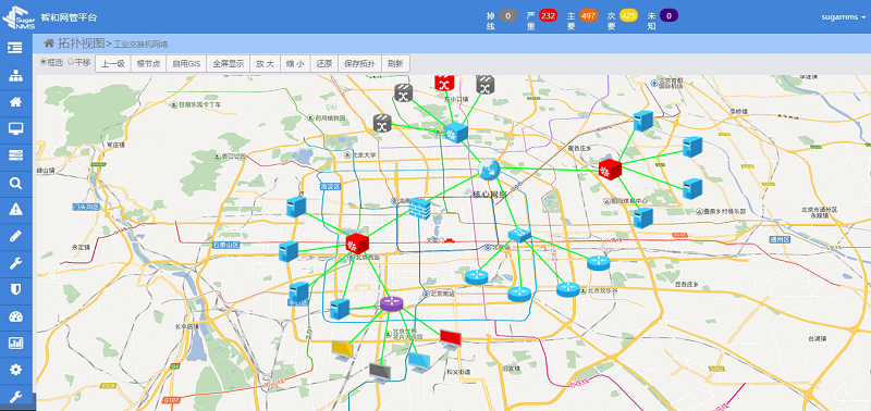 在拓扑部分,智和网管平台新增了GIS地图拓扑的模式,整个拓扑背景根据地图实时变动,充分利用地图的便利性,设备、链路等信息与地图信息相关联,能够在图上进行直观显示。