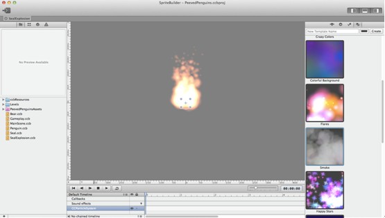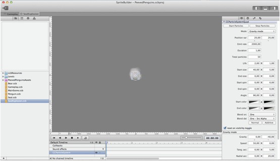 SpriteBuilder集成了一个很强大的粒子特效设计器,我们将用他来定义我们的第一个粒子效果的风格。现在,当我们的Seal被干掉的时候需要添加一个愤怒的小鸟风格的例子特效。
