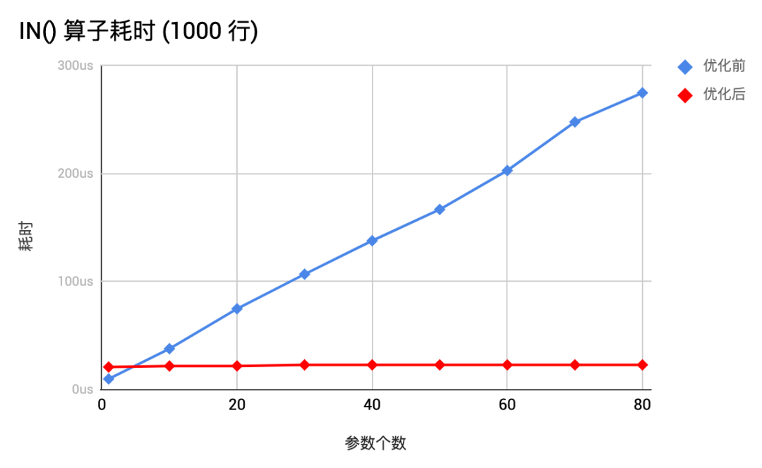 IN() 是一个大家用的很多的 SQL 内置函数。这个 PR 使得 IN() 内置函数的性能有了复杂度级别的提升,从 O(N) 提升到 O(1),如上图所示。这对于 IN() 函数中有很多参数的情况能有很大的帮助,例如在以下 1000 个参数场景中性能提升可达 150+ 倍:
