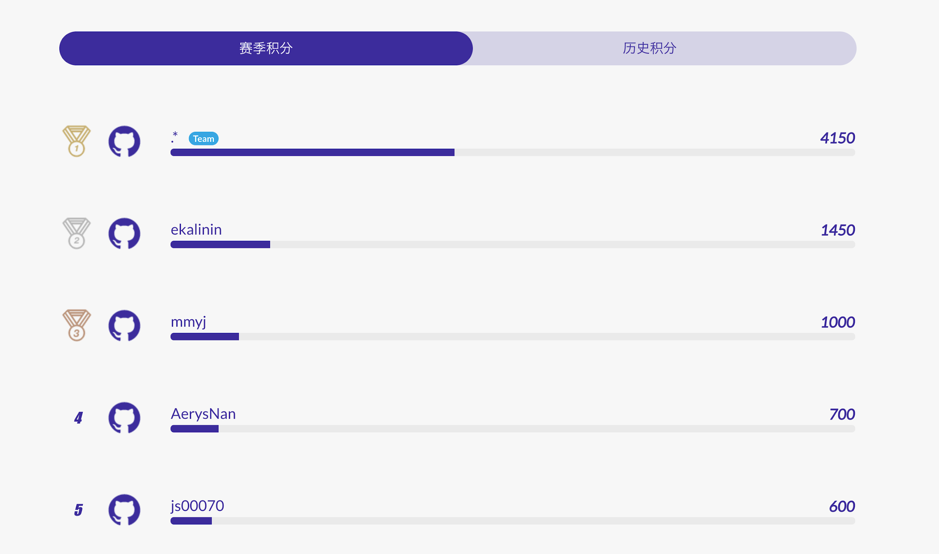截至发稿时积分排行榜前五名的参赛选手 / Team 分别是:. team、ekalinin、mmyj、AerysNan、js00070。*