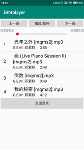 播放器主页由zhuactivity_main.xml设置了四个Button设置上一曲、播放/暂停、下一曲、退出登录,两个ListView设置当前时间、全部时间,一个Seekbar设置播放进度条。在ZHUMainActivity.java中调用自定义MyAdaper.java方法在Music.Utils.java用SQLite获取到本地数据库的歌曲,然后填充到ListView中,利用安卓MediaPlayer实现歌曲的播放/暂停、上一曲、下一曲的切换。