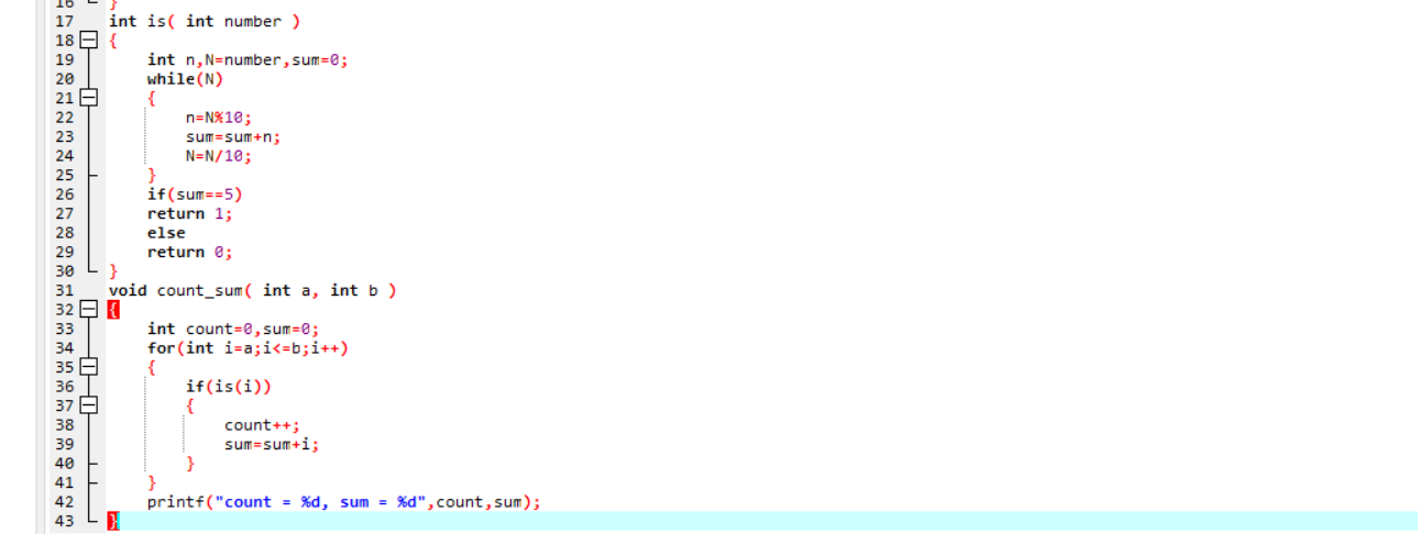 第二个函数定义count=0,sum=0,i;分别表示满足的数的个数,和,用于for循环。