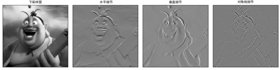 对于二维图像Haar变换不再从一个方向进行滤波,而是从水平和竖直两个方向进行低通和高通滤波(水平和竖直先后不影响),用图像表述如图所示:图中a表示原图,图b表示经过一级小波变换的结果,h1 表示水平反向的细节,v1 表示竖直方向的细节,c1表示对角线方向的细节,b表示下2采样的图像。图c中表示继续进行Haar小波变换。一级Haar小波变换实际效果如图3所示: