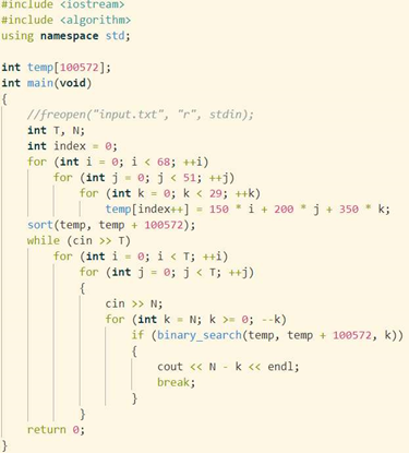 第三题思路:(暴力求解)N最大为10000,若全部都买150的药品.则可买68份;若全部都买200的药品,则可买51份;若全部买350的药品,则可买29份。采用组合方式,三层for循环找出所有可能的购买方式,将所有购买方式所用费用存入数组。对数组进行排序。输入随身钱数T,根据二分查找方法,从费用数组中找到小于T的最大值即可。