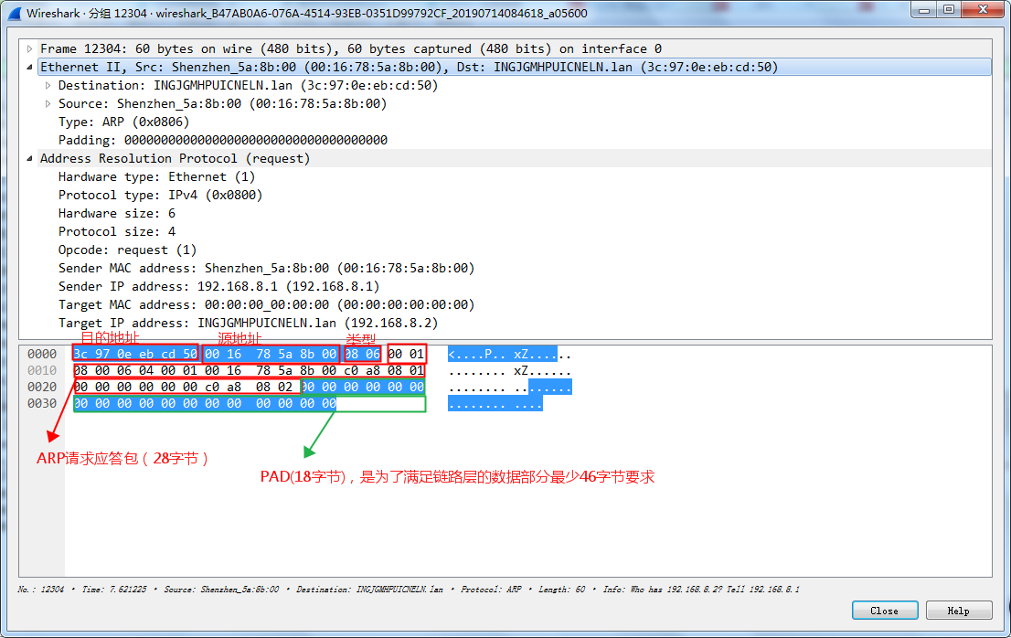 类型字段后是数据,对于以太网,规定数据段的大小范围是46个字节到1500个字节,不足的要用空字符填满,如ARP协议的数据格式为28字节,其后使用18个字节的占位符填充,满足最小长度