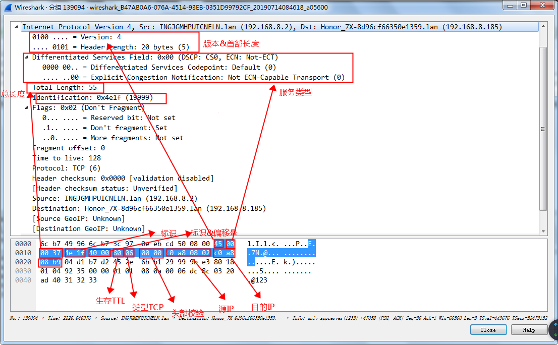 注意:数据段的长度有一个最大值MTU即最大传输单元,以太网为1500,如果IP层有一个要传送的数据长度比MTU大,在IP层数据要进行分片