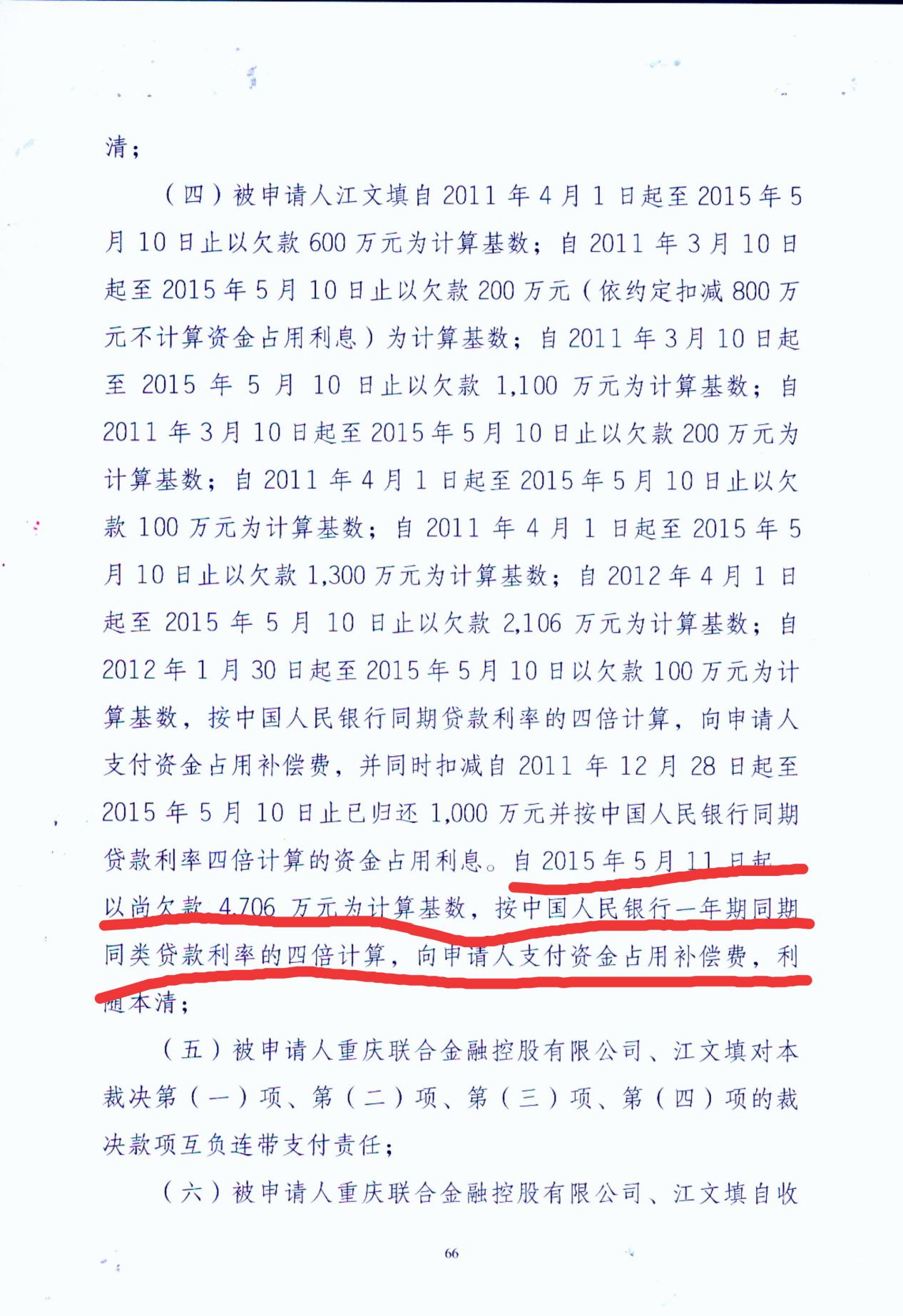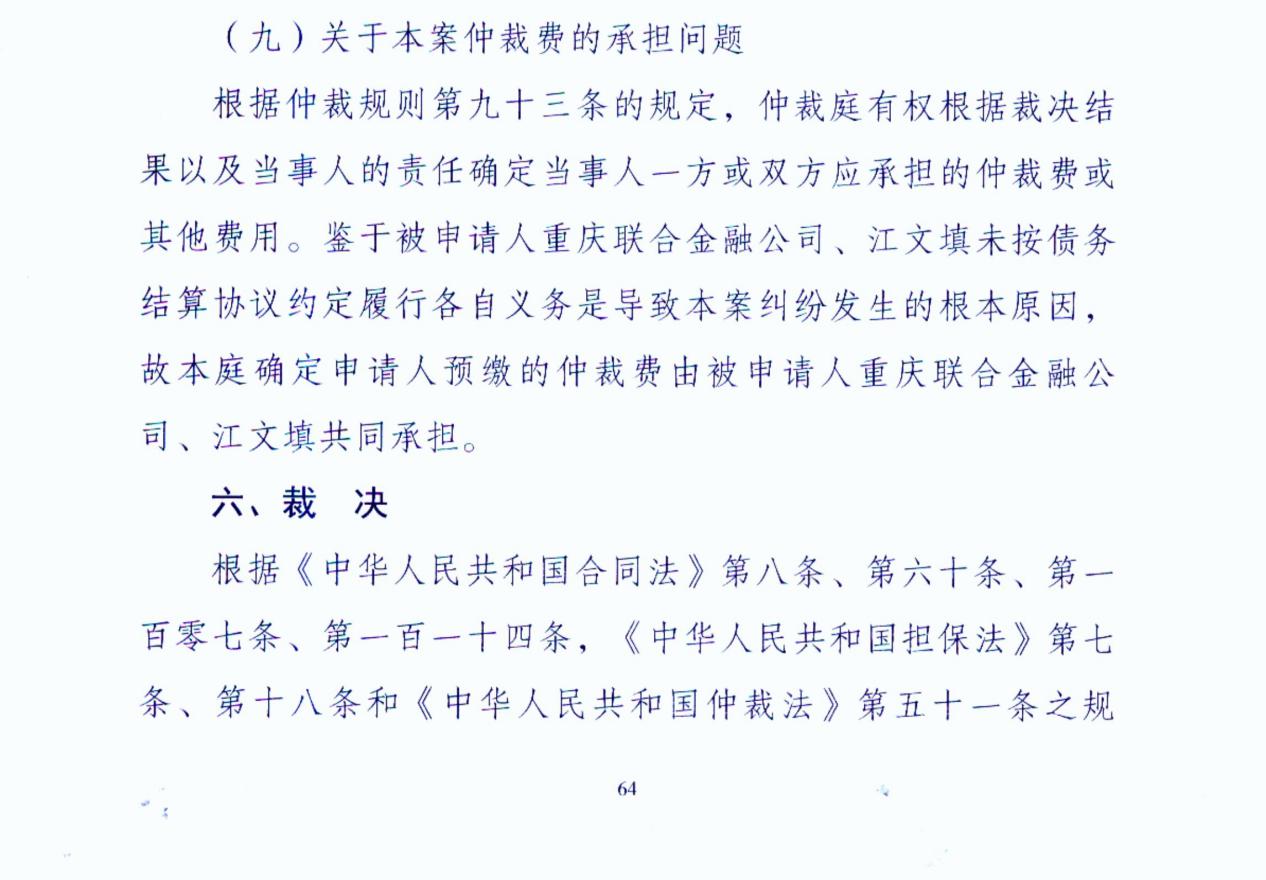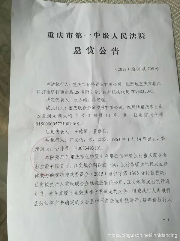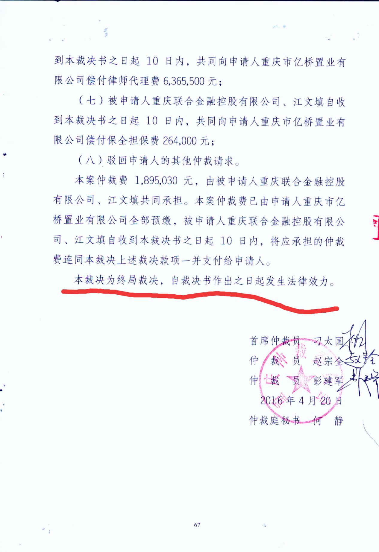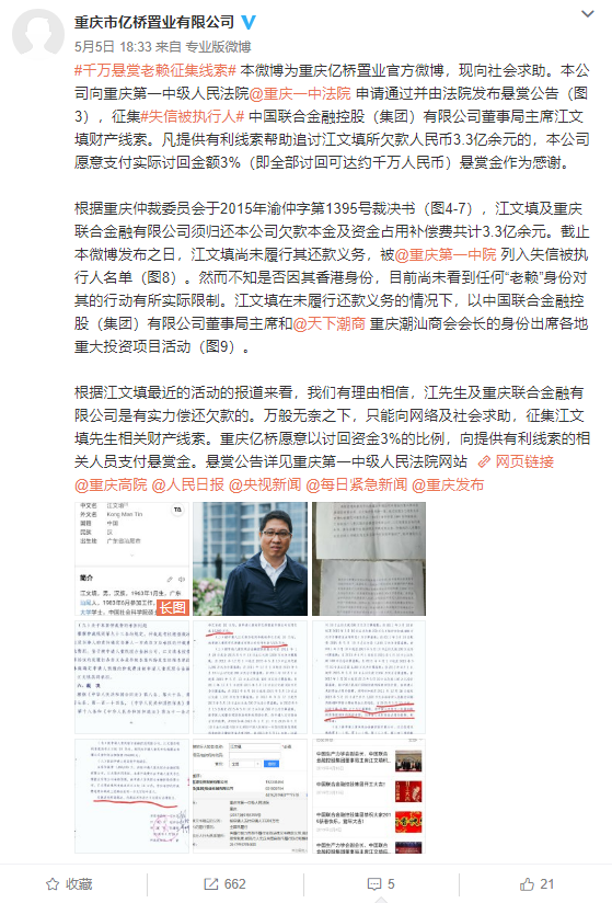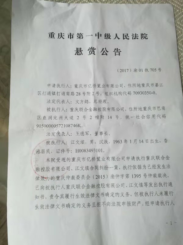 多年追讨未果 根据亿桥置业的微博,记者看到其发布的重庆仲裁委员会(2015)渝仲字1395号裁决书相关文件。从2011年到2015年间,江文填及重庆联合金融控股有限公司以合作和借款的名义先后接受重庆亿桥置业多达1亿余元的汇款,并多次签订承认债务和承诺还款的《承诺书》和《债权协议》 。而到2016年最终裁决结果出来,到法院悬赏的2019年1月,江文填及重庆联合金融控股有限公司依旧尚未还款。