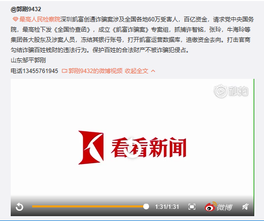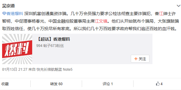 【江文填】 而就在去年,微博上又有多位广东民众发声,曾其参与深圳凯富创通发起的集资项目乃非法集资,数十万会员被骗金额上百亿。关于凯富集资的牵头人,江文填的名字也在其中。当然,此案虽已进入调查阶段,但尚未结案,其真实性和江文填的参与程度尚不可知。