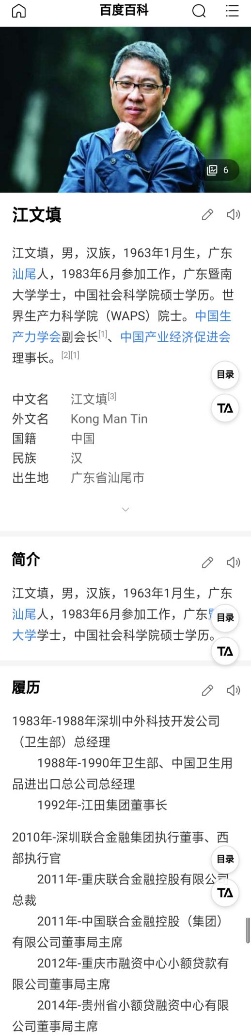 被执行人【江文填】 关于被执行人江文填,百度百科和联合金融的官方网站来看,其身份头衔众多。在担任联合金融董事局主席的同时,还任中国生产力学会副会长、重庆潮汕商会会长。而重庆和广东相关行业人员和媒体对他应该也并不陌生。上世纪九十年代,江文填到重庆做房地产项目,成为重庆第一代地产人、“外商”。其造的江田百货和江田君悦酒店,后成重庆著名的“四久工程”之一的烂尾楼,债务高达数亿元。法院在2008年就将江文填纳入老赖名单,限制其出境。多年间多次拍卖未果,2008年拍卖部分甚至被阻,直到2011年才完成全部拍卖。债务关系复杂、牵扯众多,竟花了十数年的时间才相继完成司法处置。
