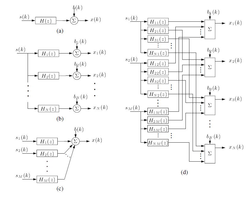对许多声信号处理和应用,特别是本书的后面,声系统的输入输出个数对算法的选择是个关键因素,涉及到复杂度。因此,声信号系统需要分类,我们相信最重要的信号输入输出决定数学模型。