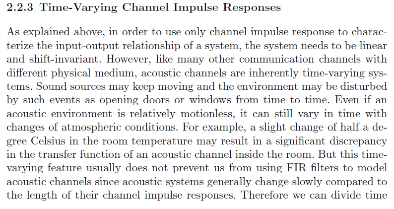 通道响应特性与输入输出系统的关系,系统需要线性时不变的。但是,很多通信通道存在物理结构的问题,而且声信号通道是时变的。声源的移动和环境的变化,以及室内环境的封闭性问题。即使一个声信号环境是紧密的封闭环境,但是依然存在高动态不平稳的特性。例如室内房间温度的变化都会导致气压变化,引起声信号传输通道变化。但是时变特性并不能阻止我们使用FIR滤波器模拟声传递通道,因为声系统改变很慢在一定长度的通道响应。