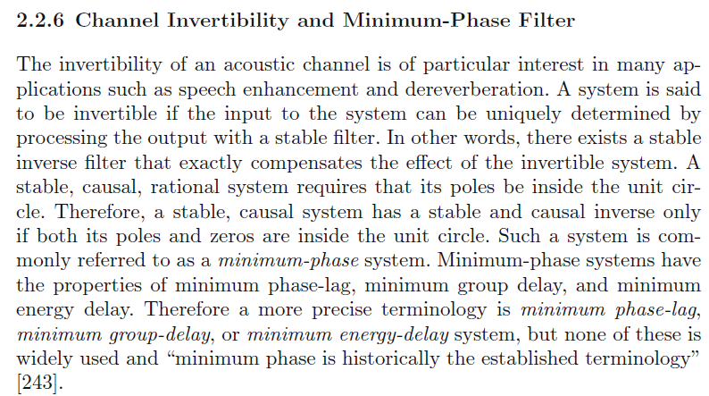 声通道的可逆性是很有用的一部分在许多应用中,如语音增强和去混响。一个系统是可逆的,输入输出之间的关系很好确定。换句话说,存在一个稳定的可逆滤波器补偿。