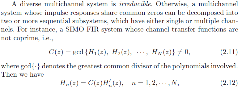 一个分集多通道系统是不可约的。但是一个多通道系统的冲击响应有共同的零点可以被分解成两个或者更多的子系统,这样我们既没有单个以及多个多通道通道。例如,一个SIMO的FIR系统,通道传递函数是互质的,
