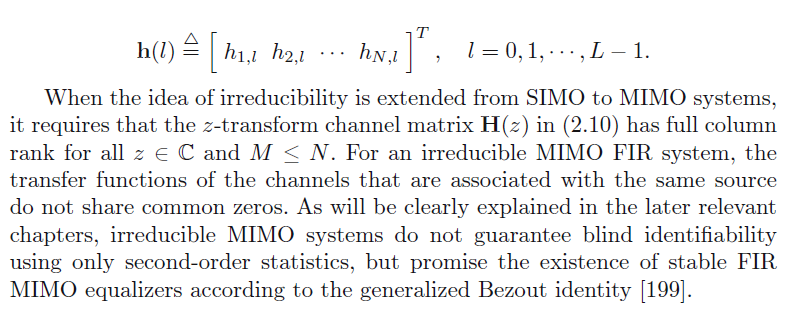 当这个不可约的特性可以从SIMO系统拓展到MIMO系统,需要Z变换,得到H(Z)。