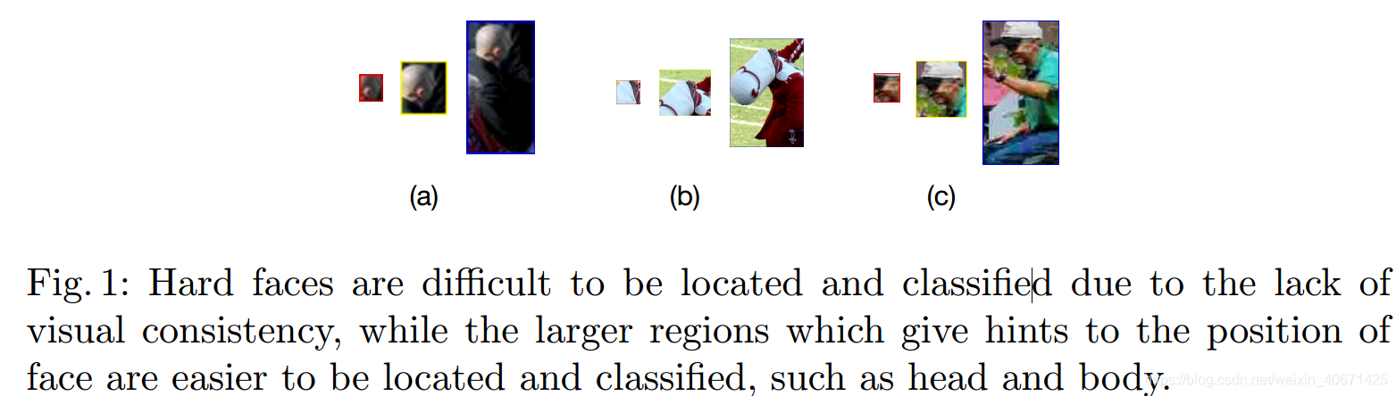 如何利用上下文信息来检测人脸没有引起太多关注,但是对于很难检测的人脸,上下文信息扮演了一个很重要的角色。如图一所示,人脸在现实世界中不是独立出现的,通常有肩膀,身体提供丰富的上下文关联源以便被利用,尤其是当面部纹理因低分辨率,模糊和遮挡而无法区分时。我们通过引入一个新的上下文辅助网络框架来处理这些问题,这个框架可以充分利用上下文信号,如下面几个步骤所示。