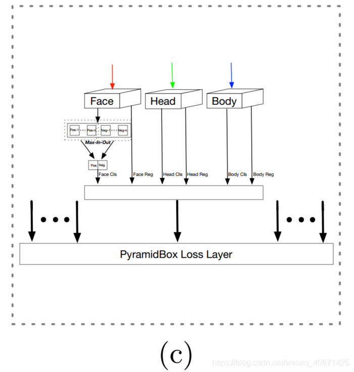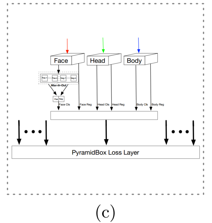 Max-in-out:Maxout第一次由Goodfellow等人提出,最近,S3FD采用max-out背景标签来降低小负样本的假阳性。本文,我们在正样本和负样本中都采用这种策略,max-in-out定义如图三(c)所示。首先,对每个预测模块预测cp+cn的得分,然后选择最大的cp作为正得分。同样地,选择让cn的最大得分最为负得分。在实验中,第一个预测模块设置cp=1,cn=3,因为小anchor具有更复杂的背景,而对于其他的预测模块为了召回更多人脸,设置cp=3,cn=1。