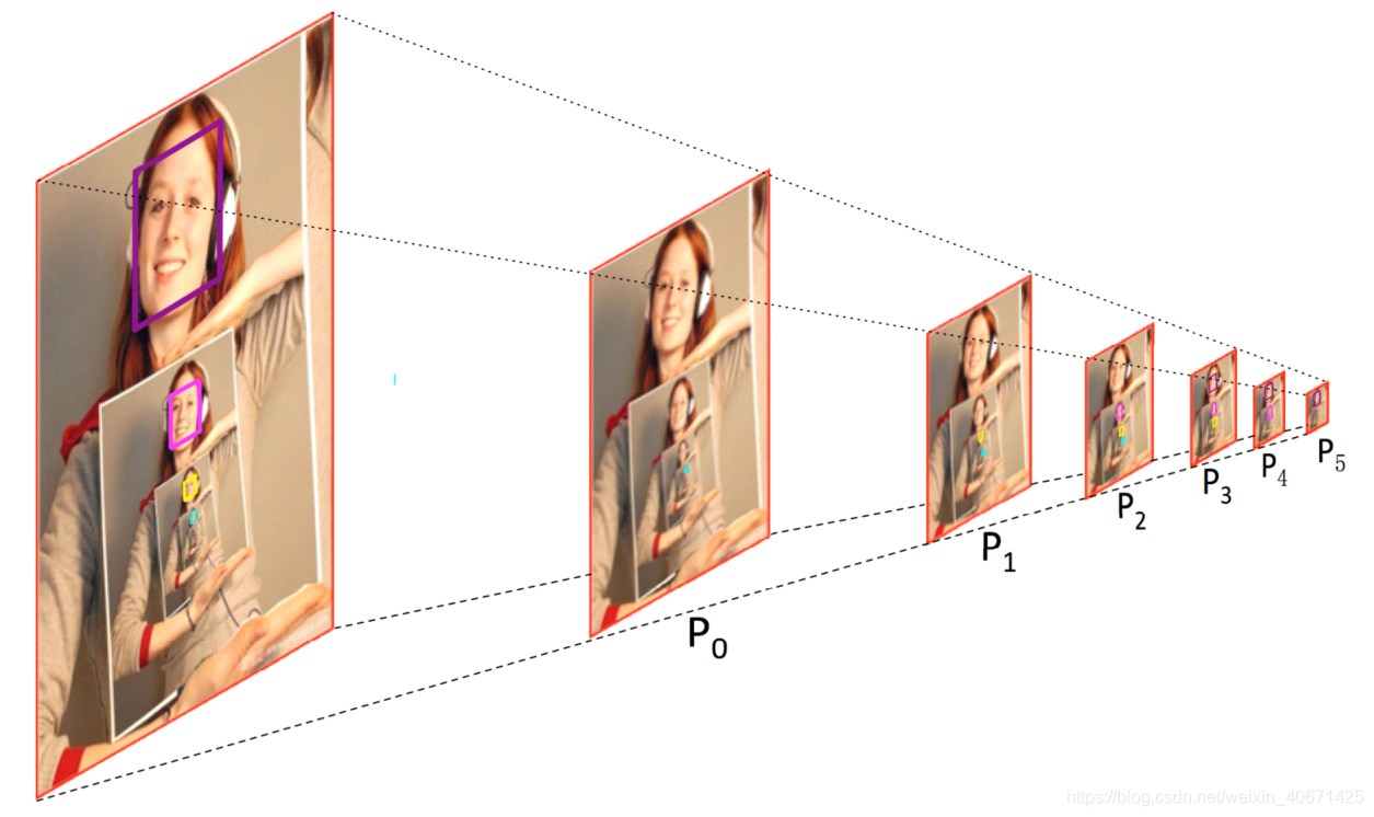 图4解释了PyramidAnchors。例如,对于最大的紫色人脸尺寸为128,在p3,p4,p5处具有pyramid-anchors,其中P3处的anchors是由face-self(人脸本身)标记的conv_fc7生成的。P4处的anchors是由目标人脸的人头(尺寸大约为256)标记的conv6_2生成的。P5处的anchors是由目标人脸的身体(尺寸大约为512)标记的conv7_2生成的(注:作者的图片和文字描述不一,笔者认为图片中紫色框P2,P3,P4应该是P3,P4,P5)。同样的,为了检测最小的尺度为16得蓝绿色人脸,可以从P0处的金字塔anchors获得一个监督特征,P0是由原始人脸标注得到。P1上的金字塔anchors由对应尺度为32的人头标注,P2上的金字塔anchors由对应尺度为64的身体进行标注。