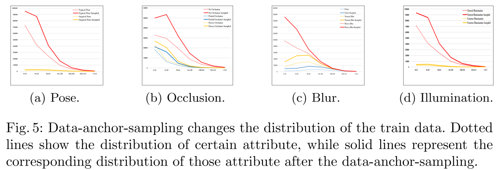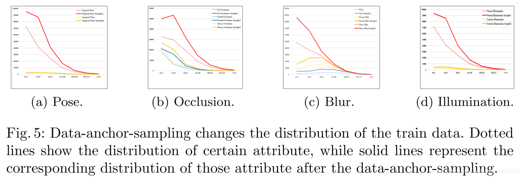 如图5所示,data-anchor-sampling以下面的方式改变了训练数据的分布:1)小脸的比例大于大脸2)通过较大的人脸样本生成较小的人脸样本增加了小尺度人脸样本的多样性。