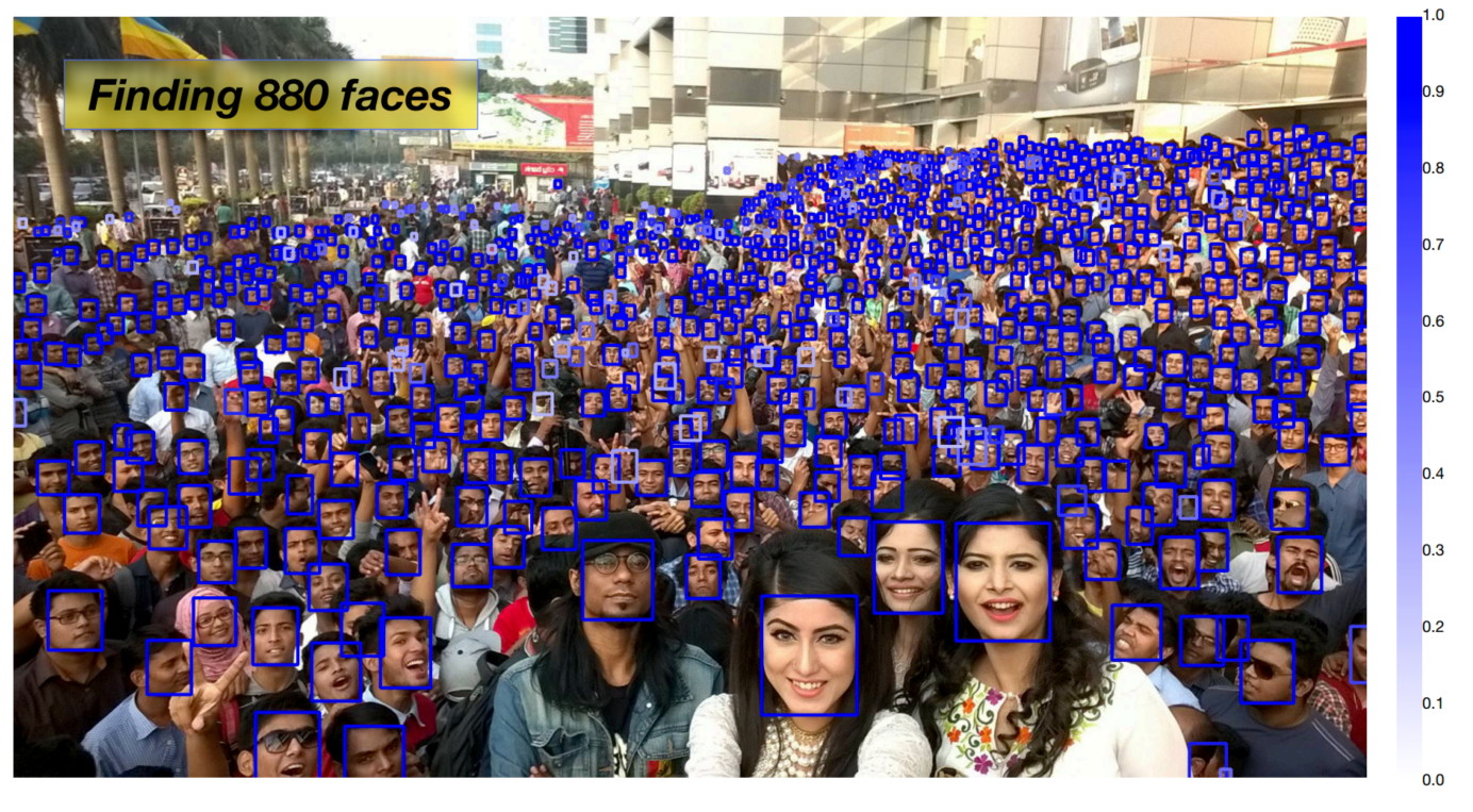 先上一个效果图,该图据报道有1000人,PyramidBox人脸检测器检测到了880张人脸,图片右侧的颜色条表示检测置信度,可以发现只有少数boxes(人脸)的置信度比较低。颜色越浅,置信度越低。