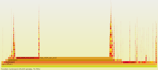 直接通过火焰图就能看到各个函数占用的百分比,比如上图就能清楚地知道rsaz_1024_mul_avx2和rsaz_1024_sqr_avx2函数 占用了75%的采样比例。那我们要优化的对象也就非常清楚了,能不能避免这两个函数的计算?或者使用非本地CPU方案实现它们的计算?