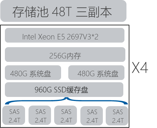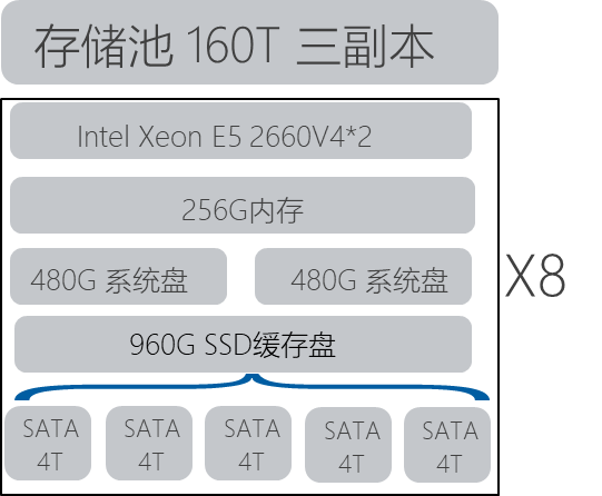 - 存储规划,8台E5-2660的服务器提供5x4Tx8的存储容量,约160T。后4台服务器提供5X2.4Tx4的存储容量,约48T。