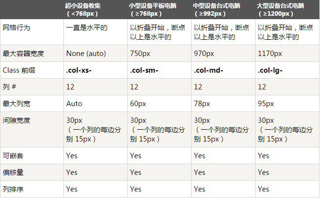 下表总结了 Bootstrap 网格系统如何跨多个设备工作: