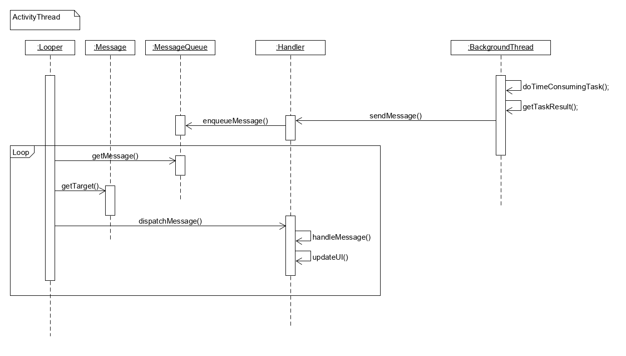 有的读者可能会奇怪,消息是通过Handler.sendMessage()发送的,Message对象如何传递到Looper.mQueue中的呢?在Handler的构造函数中,如果没有传入Looper对象,Handler会将当前线程的Looper对象和Looper的mQueue成员保存起来。在Handler.sendMessage()方法中,消息会传递给MessageQueue。