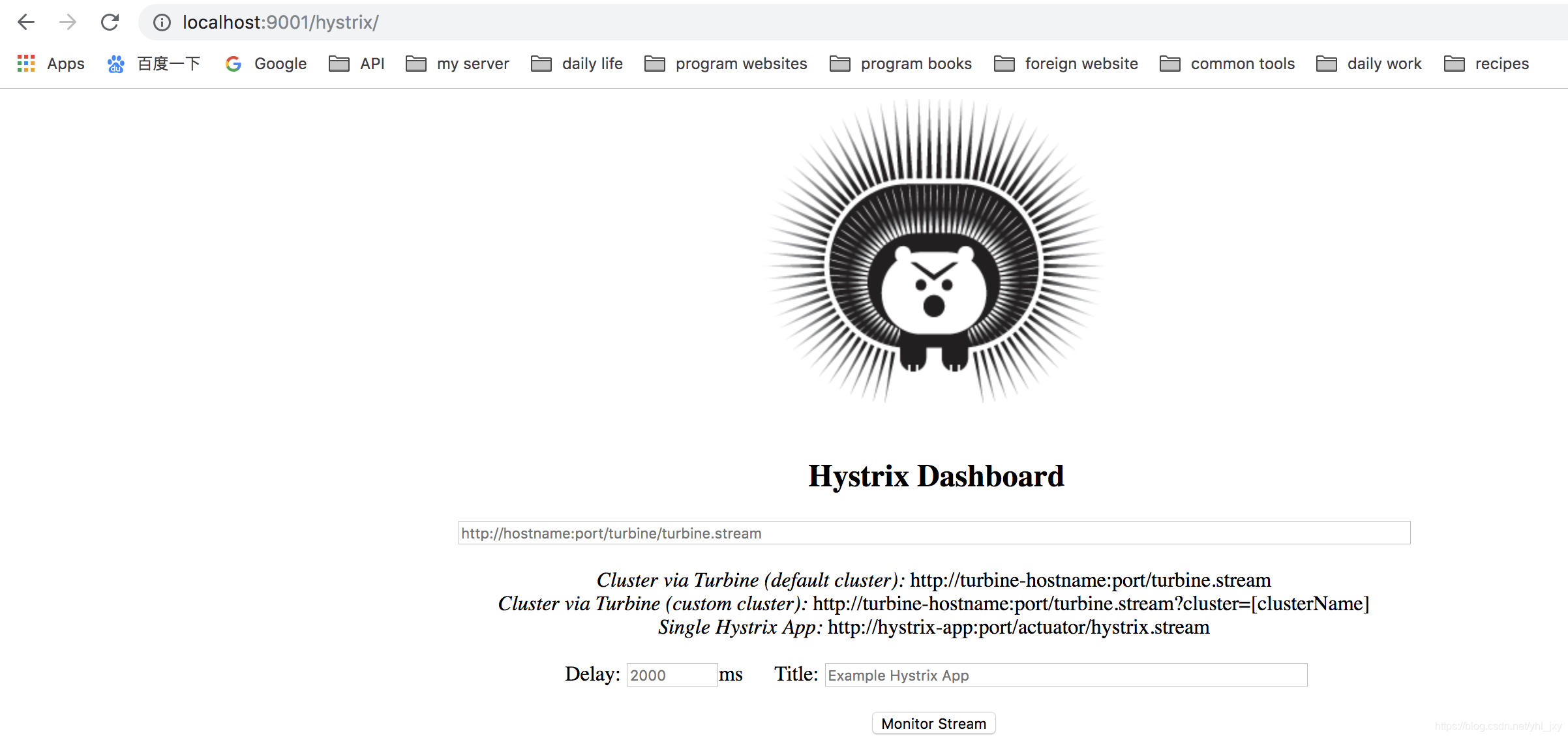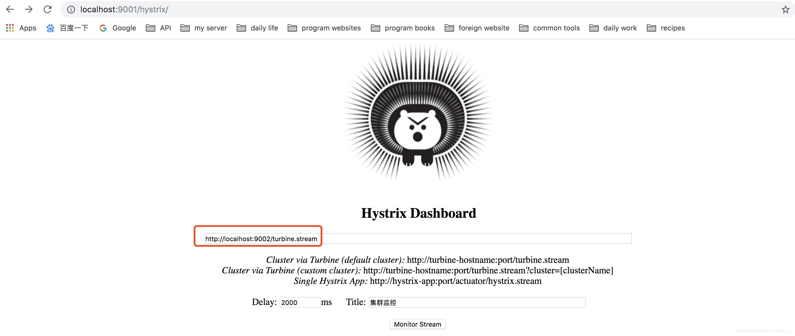 配置turbine集群监控访问地址http://localhost:9002/turbine.stream,并把Delay和Title配置。