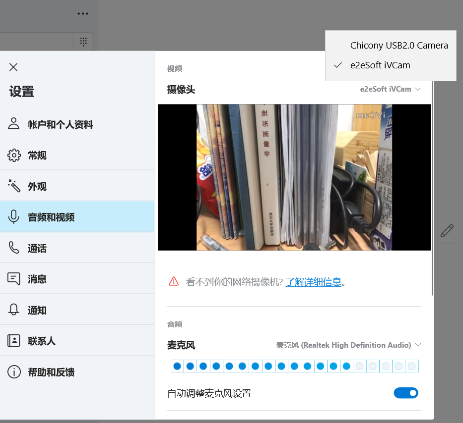 (3)其他软件也可以使用手机摄像头,例如QQ视频、skype等,使用时需在软件设置里更改要使用的摄像头(以下以Skype为例)