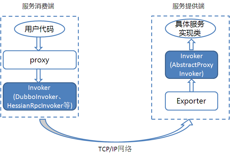 下面我们用一个精简的图来说明最重要的两种Invoker:服务提供Invoker和服务消费Invoker: