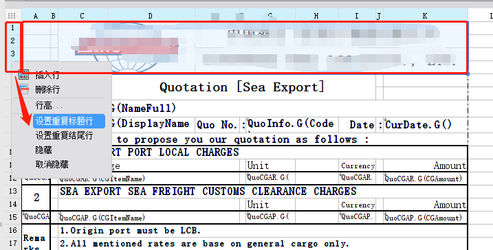 选中需要重复显示的区域,在选中区域的行号上鼠标右击,出现下拉选择项,选中'设置重复标题行'