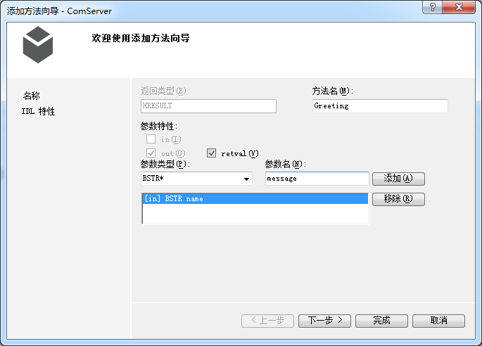 添加完成后,在ComServer.idl中会多出一个Greeting方法,这是方法向导为我们自动生成的。